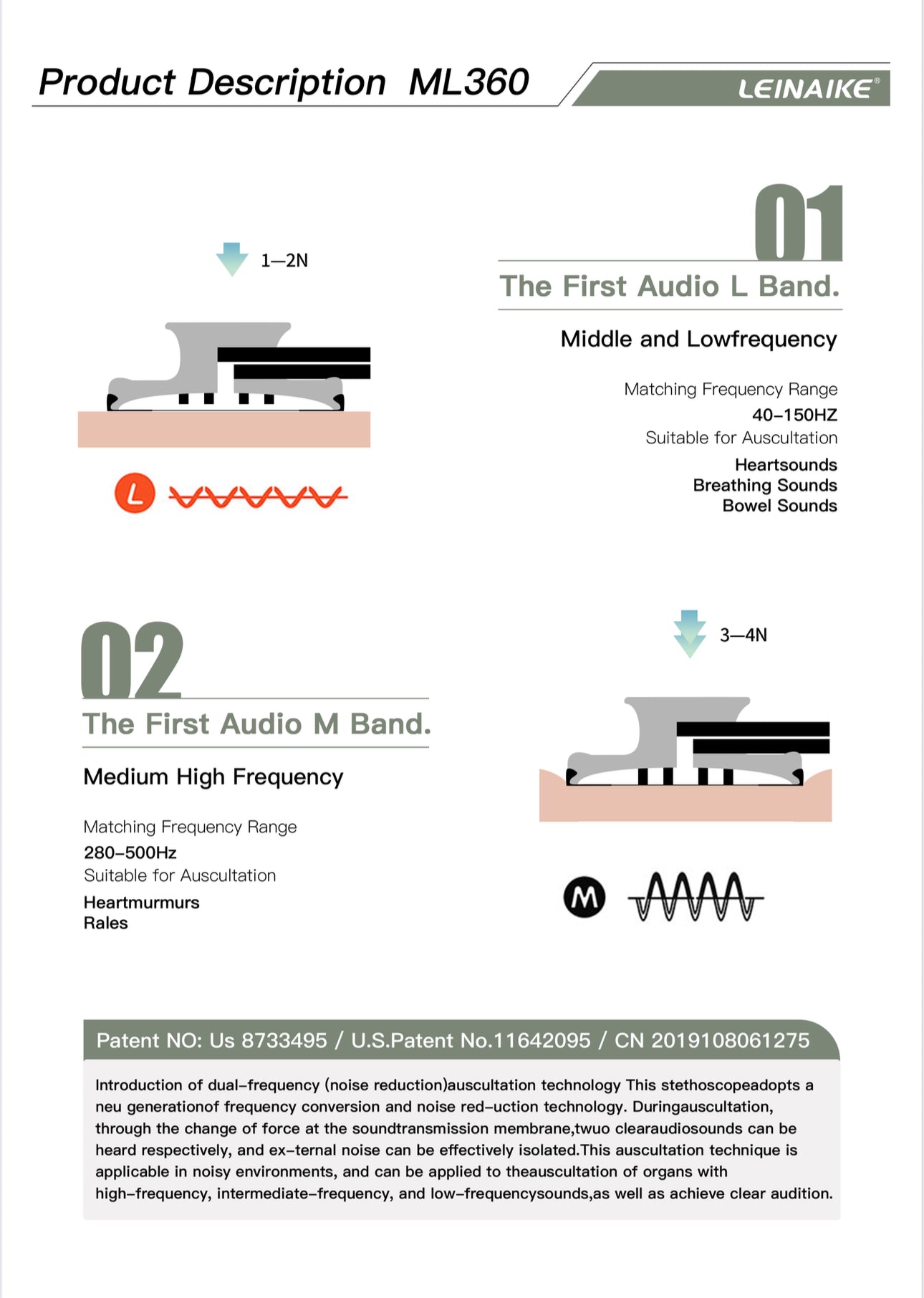 And medium-high frequency (M band) for detecting murmurs and rales (280–500 Hz)