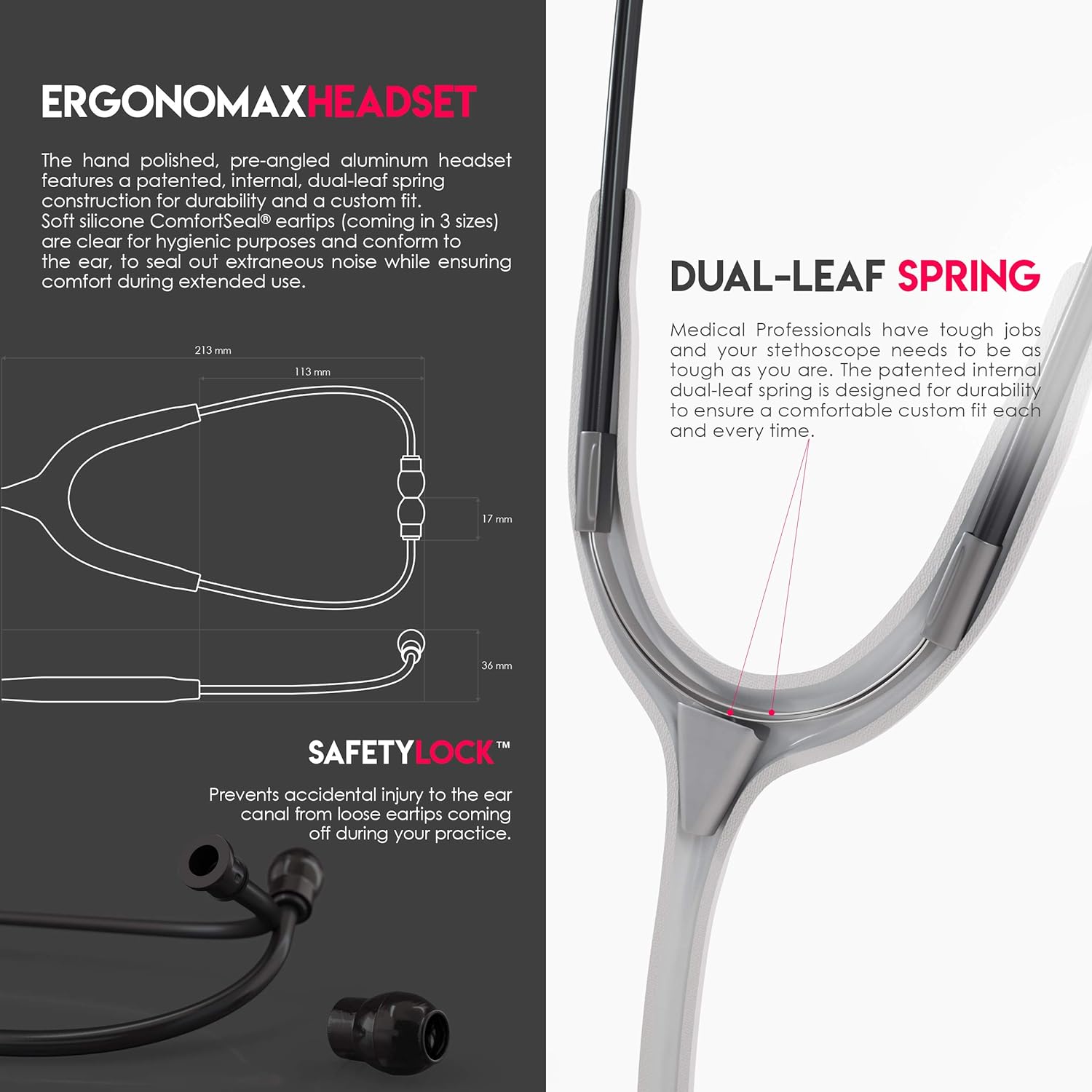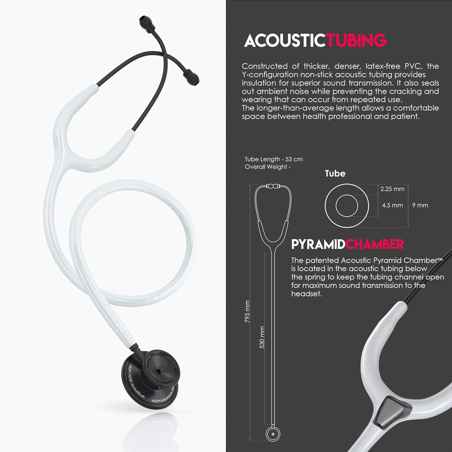 - Acoustic Tubing: The acoustic tubing is constructed from latex-free, high-density PVC, ensuring optimal sound transmission and durability.